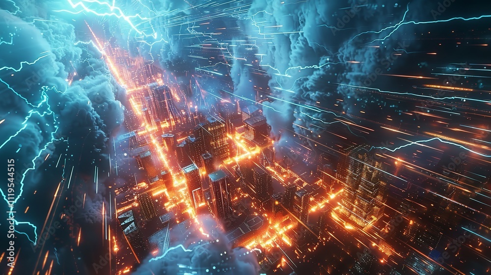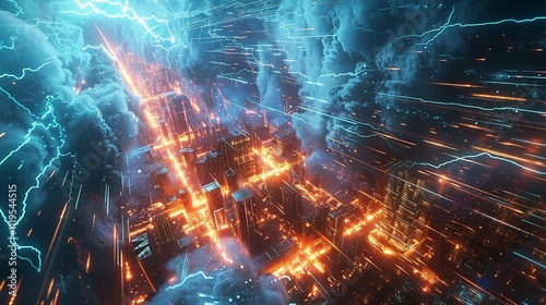 The watermark will not be included on Wall mural.: This photo depicts a striking abstract image of a blue and black background illuminated by multiple
