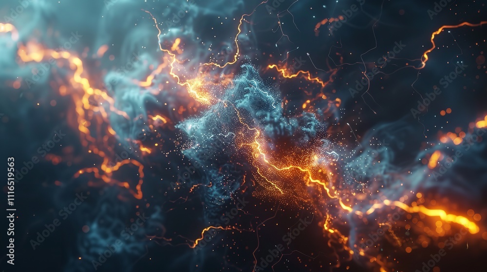 The watermark will not be included on Wall mural.: This photo depicts a striking abstract image of a blue and black background illuminated by multiple