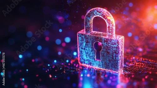 The watermark will not be included on Wall mural.: This video showcases a striking digital padlock surrounded by colorful particles - it represents the