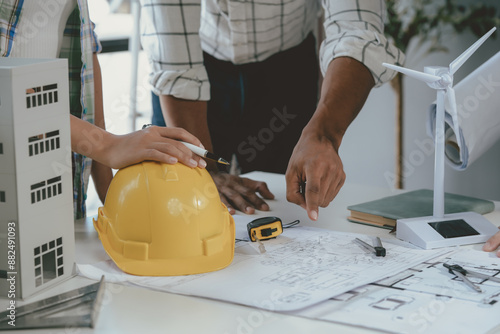 The watermark will not be included on Wall mural.: Three architects are discussing a project with a model of a wind turbine and a model of a building,