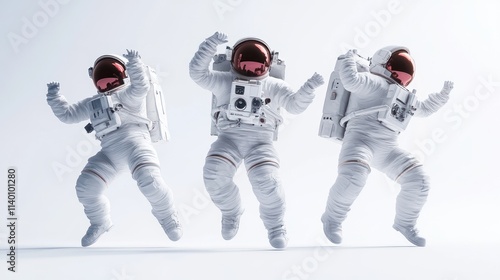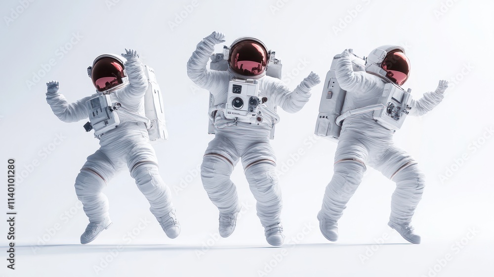 The watermark will not be included on Wall mural.: Three astronauts in white suits joyfully floating in a zero-gravity environment -