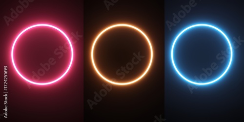 Wall mural three different colored circles with neon lights. the circles are red, orange, and blue. the circles
