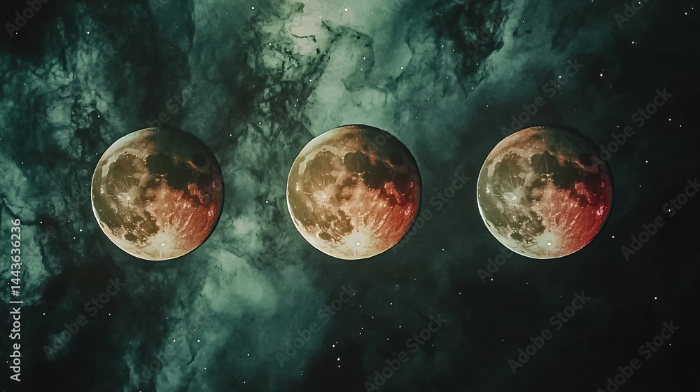 Three distinct phases of the moon captured in deep space displaying a moody shadow play against a daWall mural
