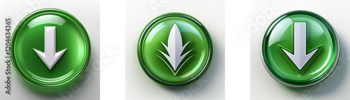 Wall mural : Three glossy green circular buttons feature variations of a downward-pointing arrow, symbolizing dow