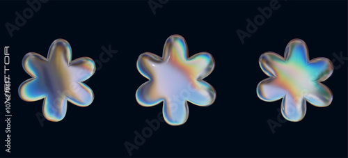 The watermark will not be included on Wall mural.: Three holographic chrome element in y2k style - 3d abstract flower isolated on dark background - vecto