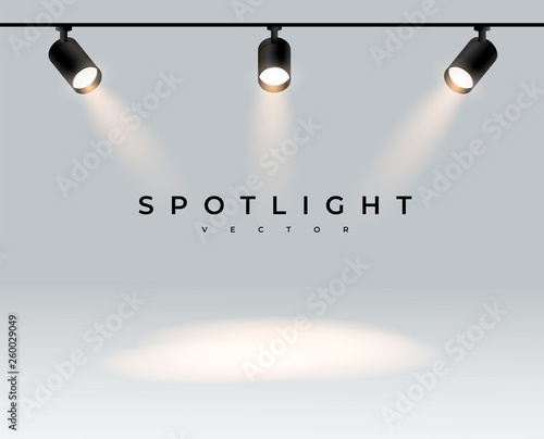 Wall mural three modern spotlights realistic transparent background for show contest or interview.illuminated e