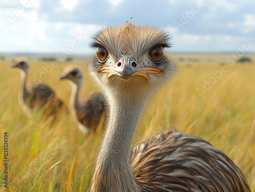 The watermark will not be included on Wall mural.: Three rheas standing in a grassy field with one facing the viewer