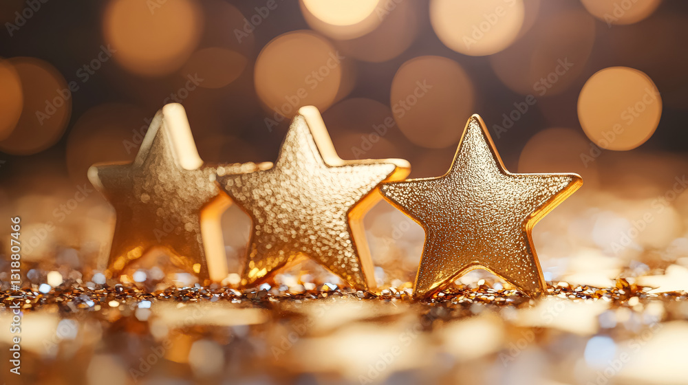 Wall mural three shiny gold stars are arranged on a gold background, creating a visually appealing and elegant  - Wall murals Wall mural three shiny gold stars are arranged on a gold background, creating a visually appealing and elegant - Wall murals