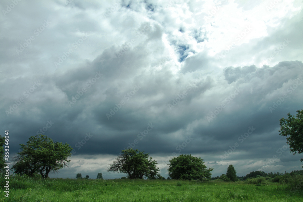 The watermark will not be included on Wall mural.: Thunderous epic clouds in a field near the old garden - stock photo background with heaven -