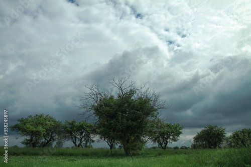 Thunderous epic clouds in a field near the old garden - stock photo background with heaven - Wall mural