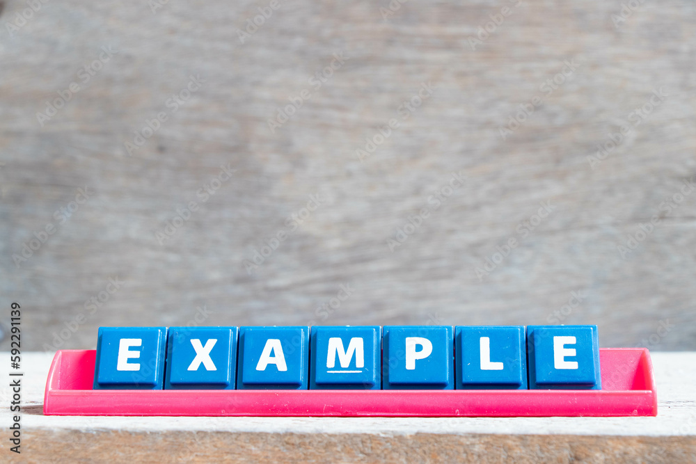 The watermark will not be included on Wall mural.: Tile alphabet letter with word example in red color rack on wood background