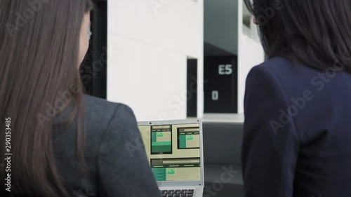Wall mural : Tilt down back view of two female professionals, middle aged and young one, sitting in office lobby