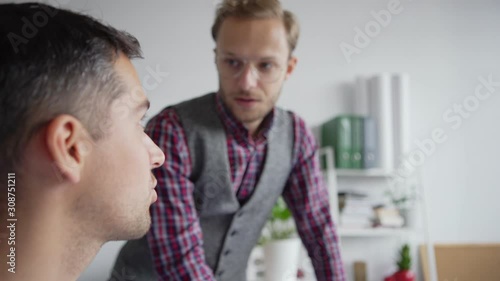 Wall mural tilt down closeup of two designers examining and discussing website interface samples for different  - Wall murals Wall mural tilt down closeup of two designers examining and discussing website interface samples for different - Wall murals