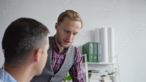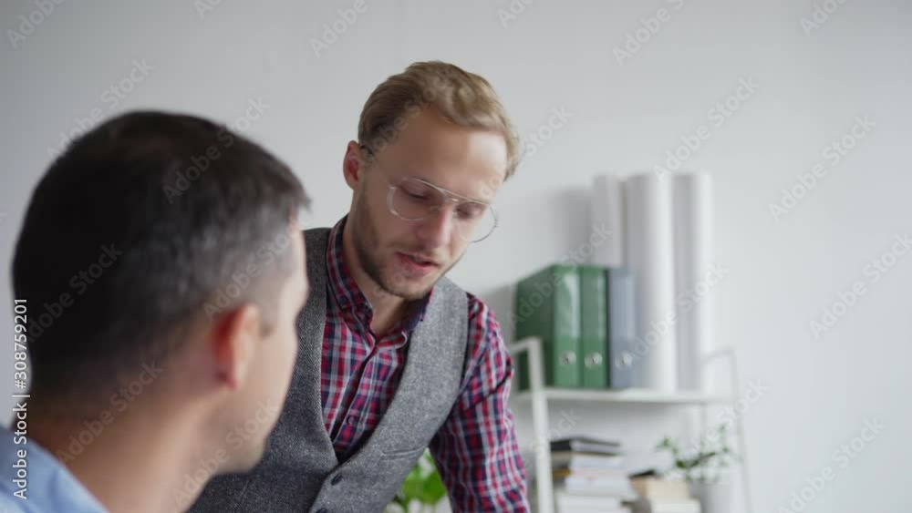 Wall mural tilt down closeup of young designer in eyeglasses showing website interface samples for different de - Wall murals Wall mural tilt down closeup of young designer in eyeglasses showing website interface samples for different de - Wall murals