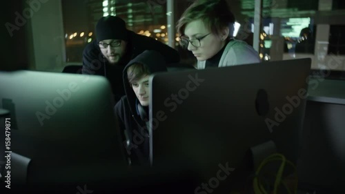 Wall mural : Tilt down of three cybercriminals working in team in front of computers in the dark office