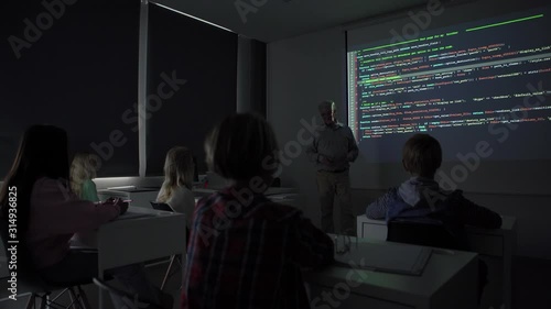 The watermark will not be included on Wall mural.: Tilt down view of mature teacher talking to audience while teaching kids programming during computer