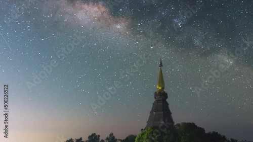 Wall mural time lapse 4k of star trails moving over a sacred temple at doi inthanon national park, chiang mai,
