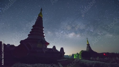 Time lapse 4k of the milky way galaxy moving over a sacred temple at doi inthanon national park, chiWall mural