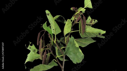 The watermark will not be included on Wall mural.: Time lapse of drying alder tree leaves in rgb + alpha matte format isolated on black background
