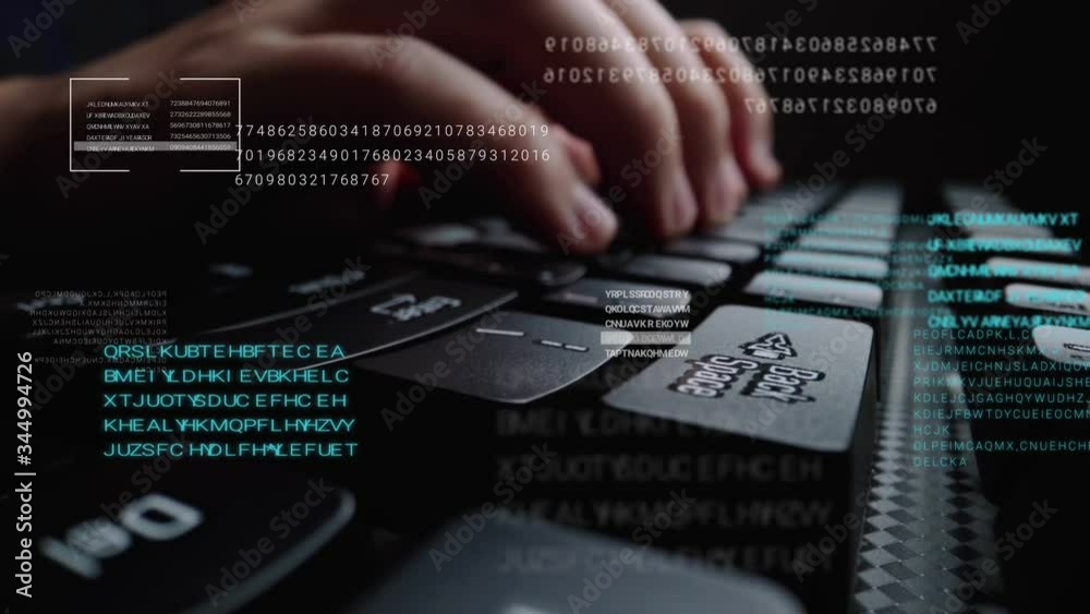 The watermark will not be included on Wall mural.: Time lapse of man working on laptop computer keyboard with graphic user interface gui hologram showi