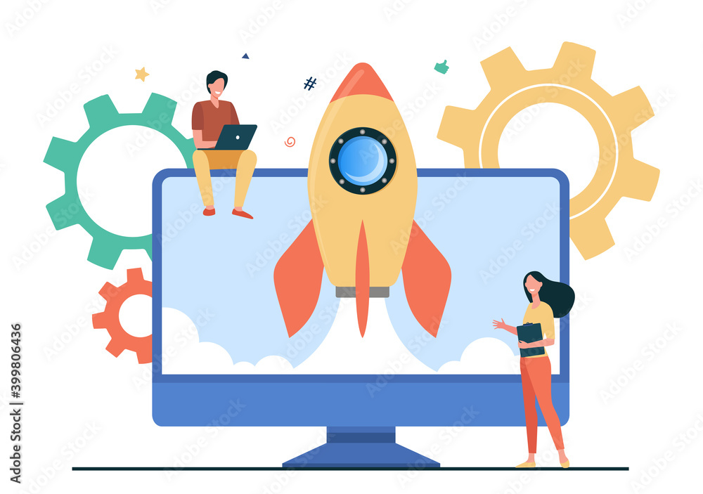 The watermark will not be included on Wall mural.: Tiny character launching startup rocket - monitor, computer, idea flat vector illustration - business