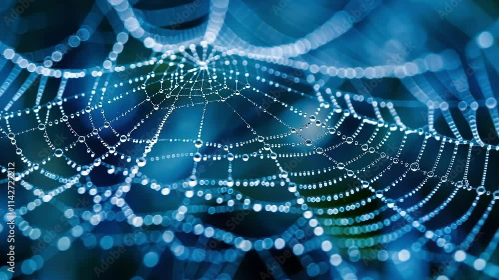 Wall mural tiny dew drops clinging to the intricate threads of a spider web, glistening in the soft blue light, - Wall murals Wall mural tiny dew drops clinging to the intricate threads of a spider web, glistening in the soft blue light, - Wall murals
