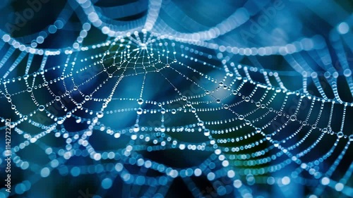 Wall mural : Tiny dew drops clinging to the intricate threads of a spider web, glistening in the soft blue light,