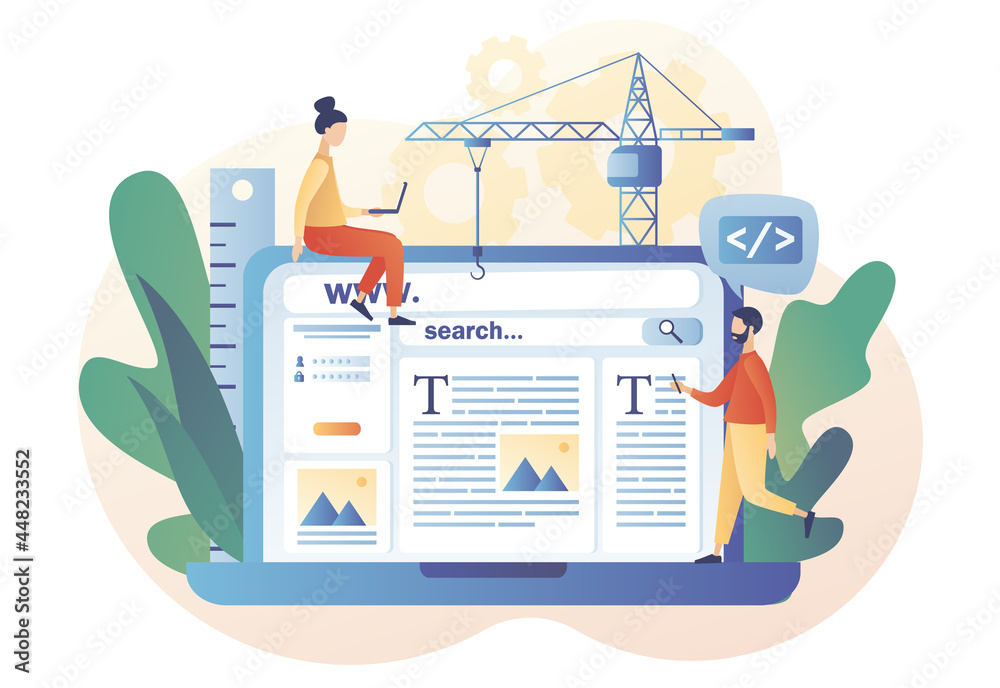 Wall mural tiny people building webpage on laptop. web design concept. website interface design. software devel - Wall murals Wall mural tiny people building webpage on laptop. web design concept. website interface design. software devel - Wall murals