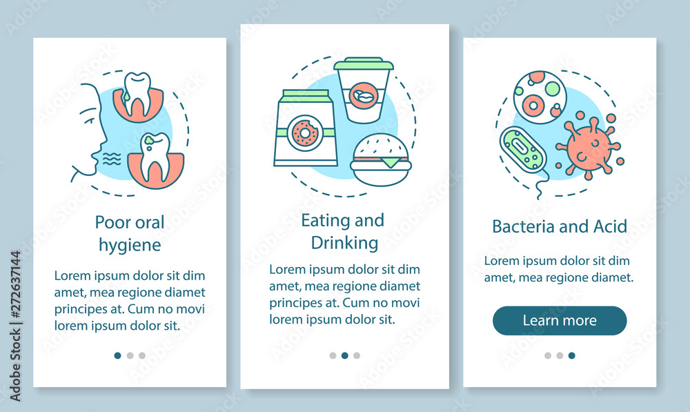 Wall mural : Tooth diseases causes onboarding mobile app page screen with linear concepts