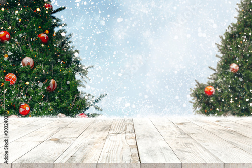 Wall mural top of empty wood table with beautiful christmas tree and snowfall backdrop. ready for your product