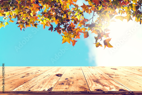 Top of wood table with beautiful autumn maple tree on sky background - empty ready for your product Wall mural