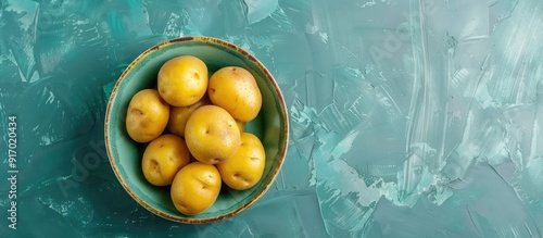 Wall mural top view of a bowl with fresh raw potatoes on a green background with copy space image available - Wall murals Wall mural top view of a bowl with fresh raw potatoes on a green background with copy space image available - Wall murals