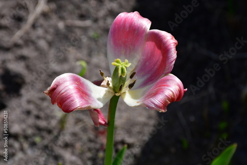 Wall mural : Top view of a fading open tulip flower in natural conditions in the garden on a blurred background -