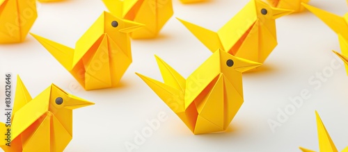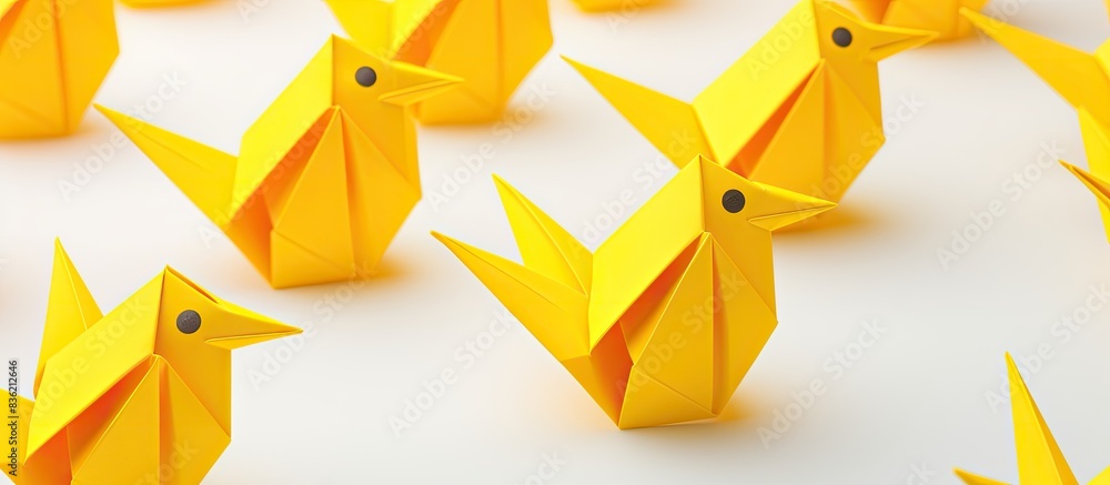 Wall mural : Top view of a lovely yellow origami bird against a white backdrop with ample space for a message in