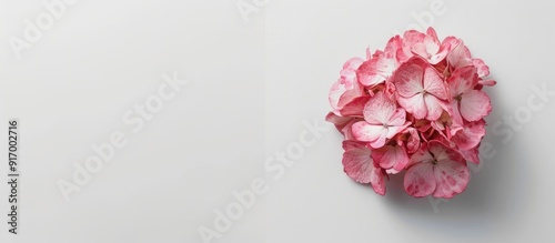 The watermark will not be included on Wall mural.: Top view of a pink hydrangea flower on a white backdrop with a generous copy space image for text in