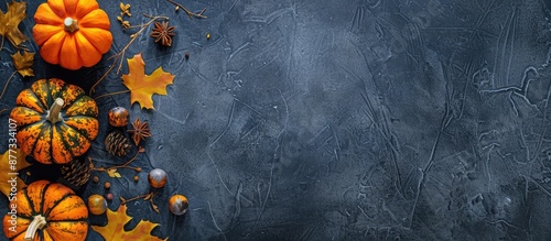 The watermark will not be included on Wall mural.: Top view of a pumpkin themed decor with space for text or images - copy space image - place for adding