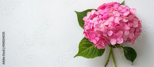 The watermark will not be included on Wall mural.: Top view of a solitary pink hydrangea flower on a clean white surface for adding text a copy space i