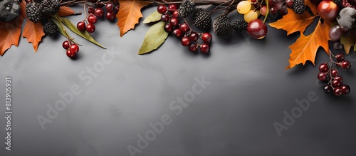 Top view of a thanksgiving day concept with a flat lay composition of dried leaves berries and a graWall mural
