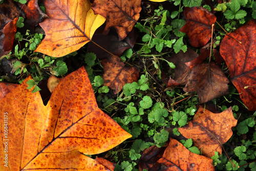 Top view of autumnal leaves of tulip tree with raindrops on grees grass backgroundWall mural