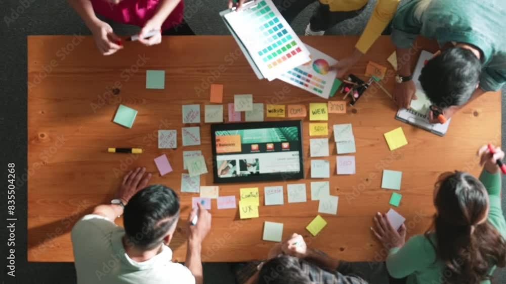 The watermark will not be included on Wall mural.: Top view of business people working together to design web design - aerial view of designer brainstor