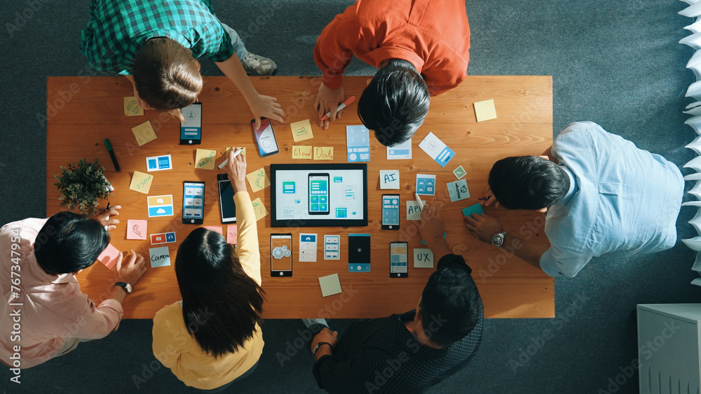 Wall mural top view of developer team working together to write idea about ux ui design on whiteboard. smart pr - Wall murals Wall mural top view of developer team working together to write idea about ux ui design on whiteboard. smart pr - Wall murals