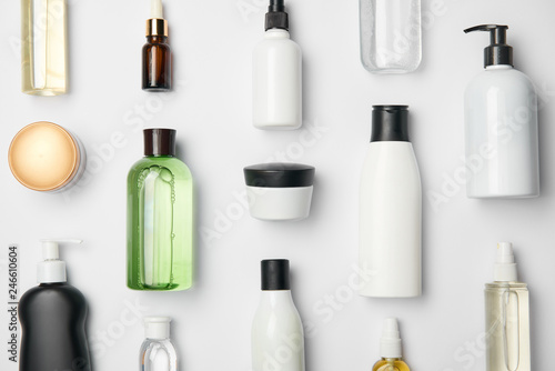 Wall mural : Top view of different cosmetic bottles and container on white background