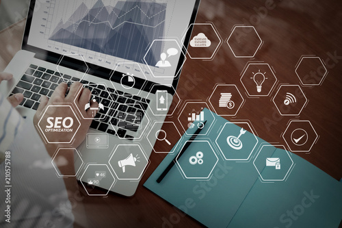 Wall mural top view of double exposure of businessman hand working with new modern computer and business strate - Wall murals Wall mural top view of double exposure of businessman hand working with new modern computer and business strate - Wall murals