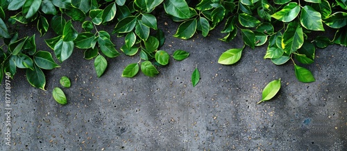 Wall mural top view of green leaves on a paved surface with a flat lay style and copy space image available