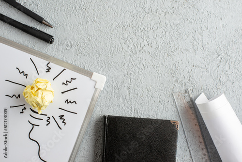 Wall mural : Top view of incompletely drawn thing and crushed wrapped paper on white desk notebook ruler on gray