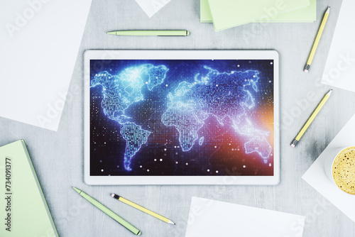 Wall mural : Top view of modern digital tablet display with abstract graphic world map, big data and networking c