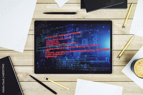 Top view of modern digital tablet display with abstract software development hologram, research and Wall mural
