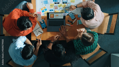 Top view of project manager using laptop working on ux ui design for mobile phone interface while maWall mural
