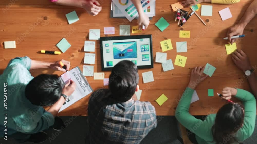 Wall mural top view of skilled business people working together to design web design. aerial view of designer b