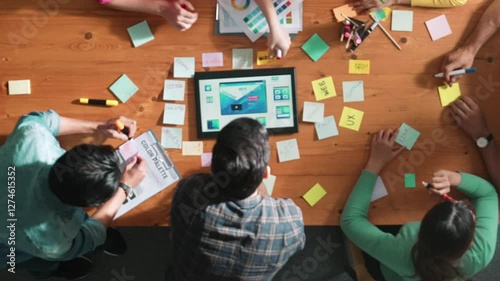 The watermark will not be included on Wall mural.: Top view of skilled business people working together to design web design - aerial view of designer b
